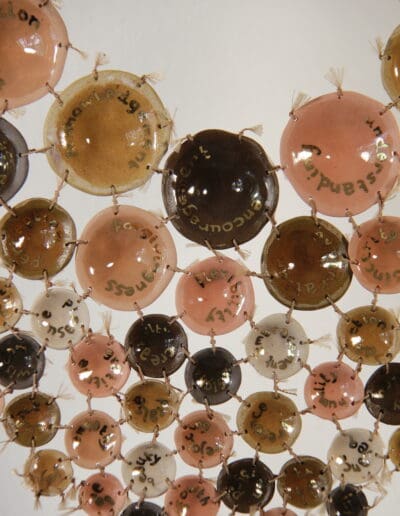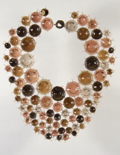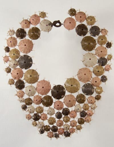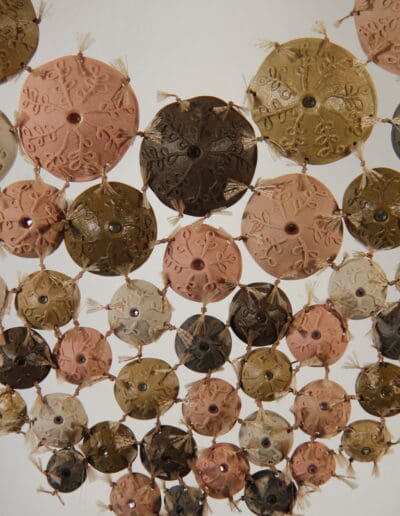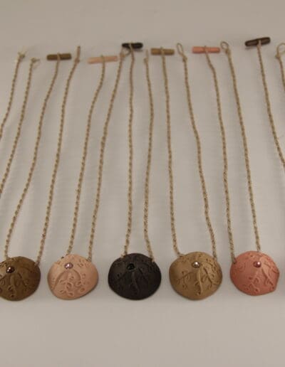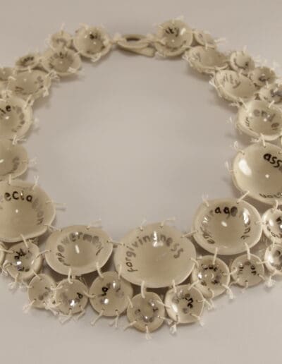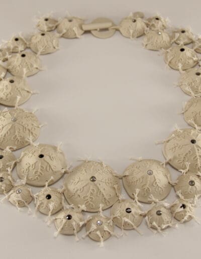 In 2012 Mon Art Gallery, Curaçao organized an exhibition around breast cancer. I wanted to make piece for all the women on the island, so I started with a preliminary study: a necklace in white porcelain, with silver luster and silver swarovsky.