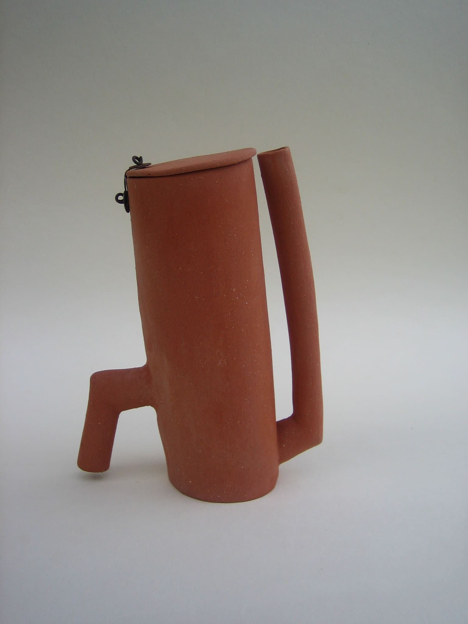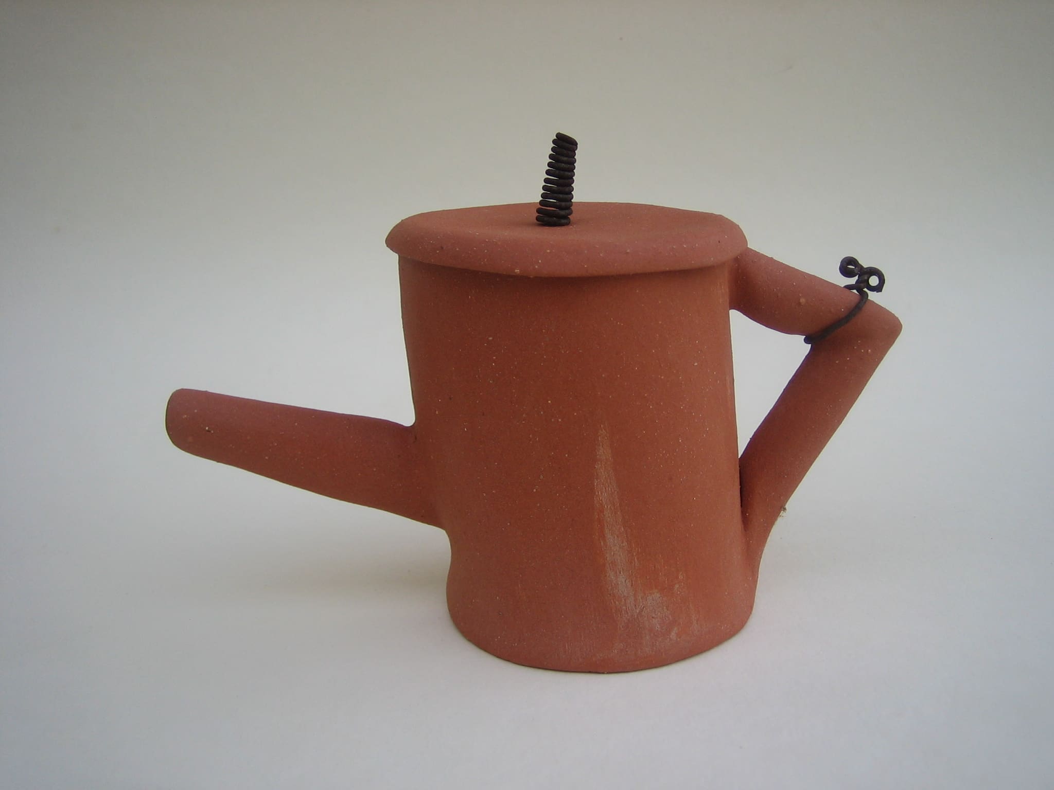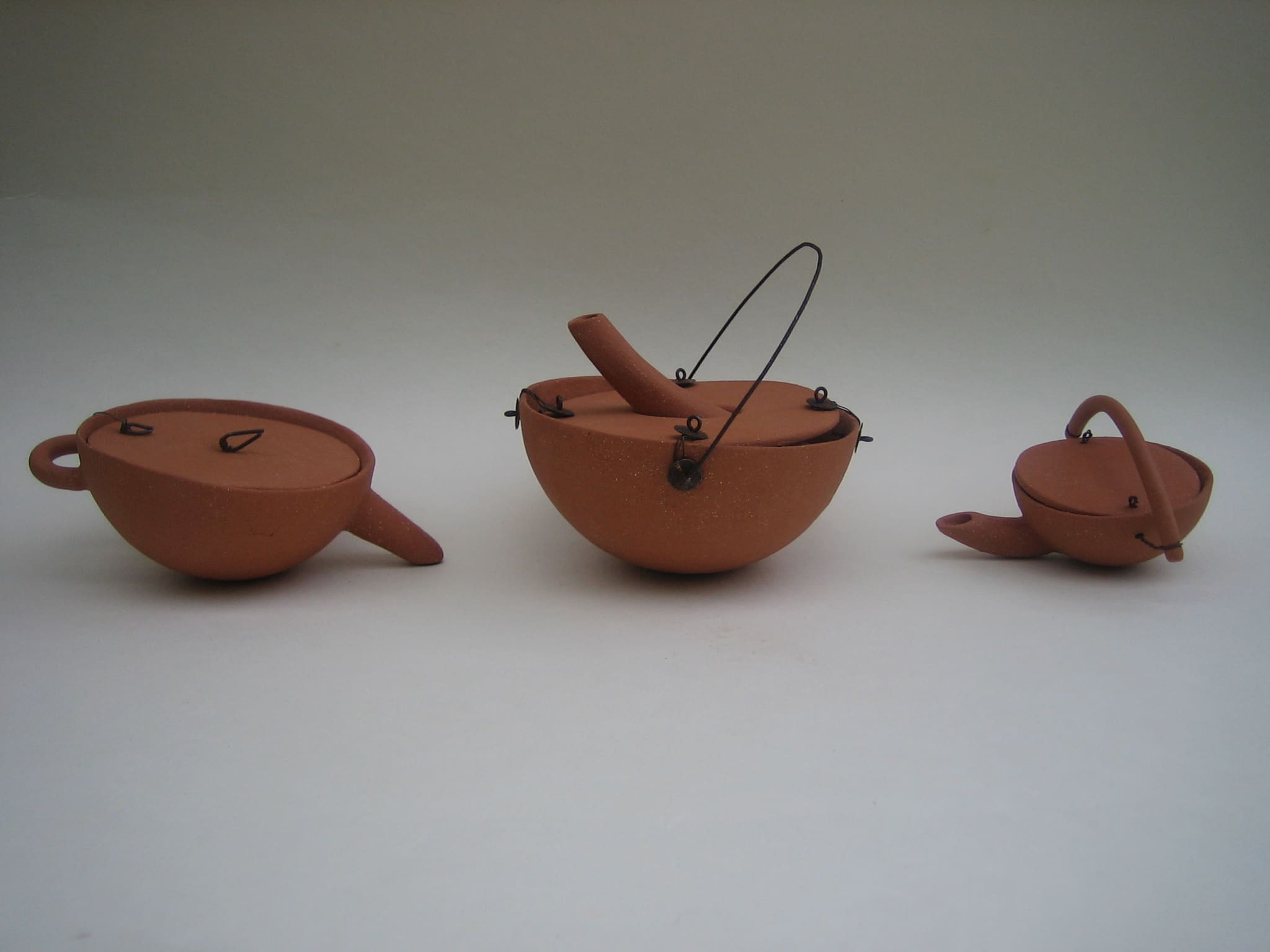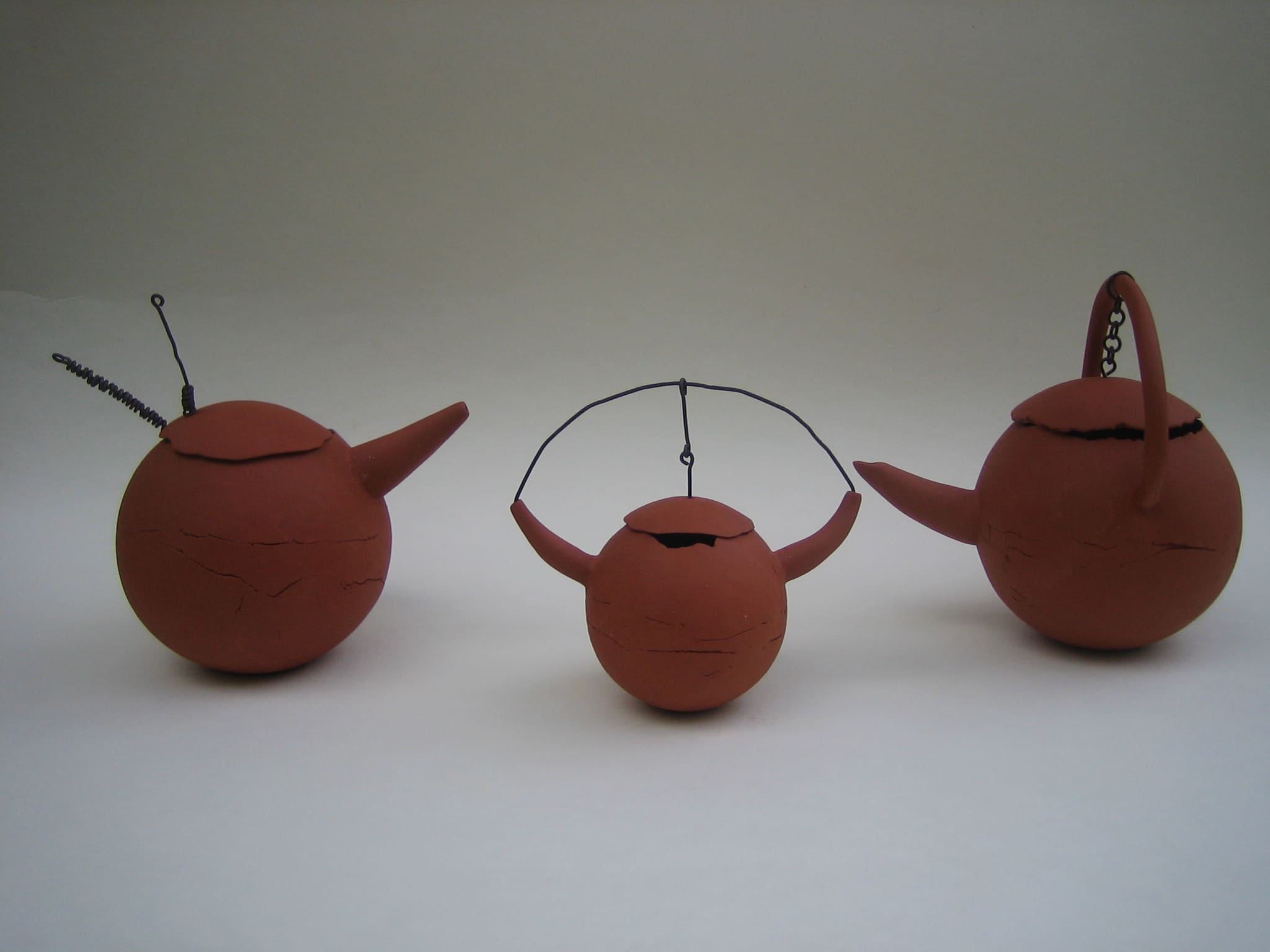 After that I wanted to do something completely opposite, so I made this series of clumsy teapots that are not teapots. None of them works like a teapot should, they are made from red chamotte clay, not glazed, and the lids are attached with rusty iron wire.