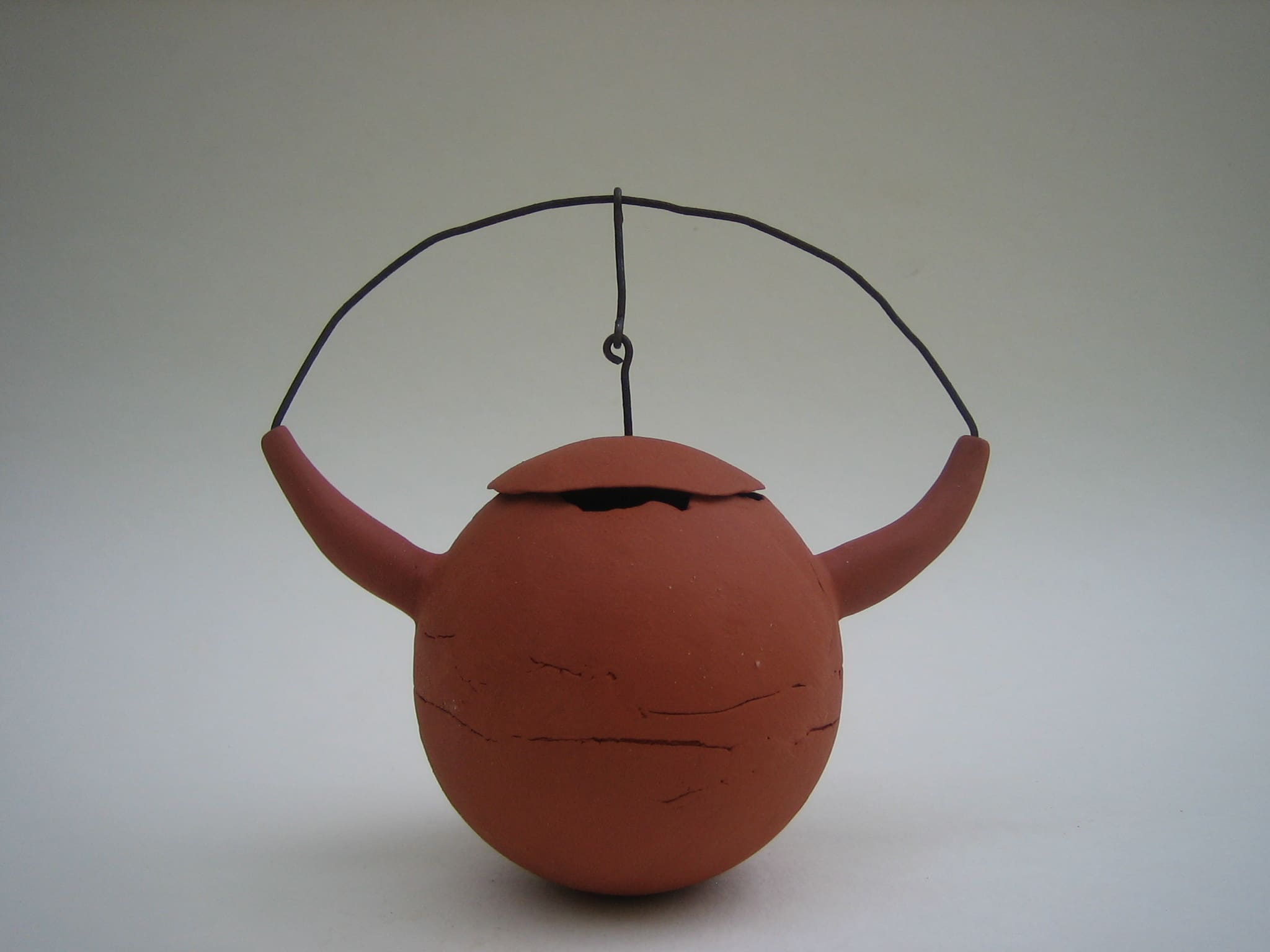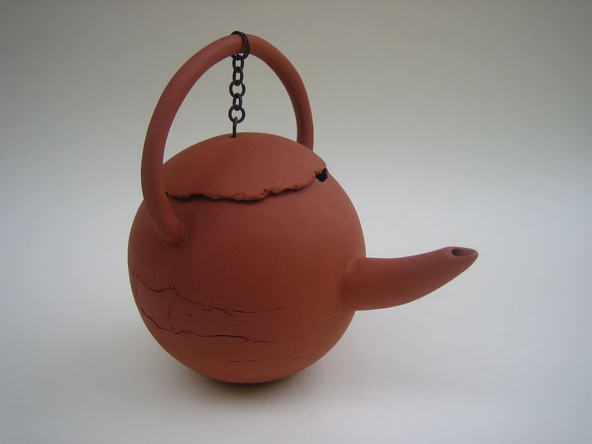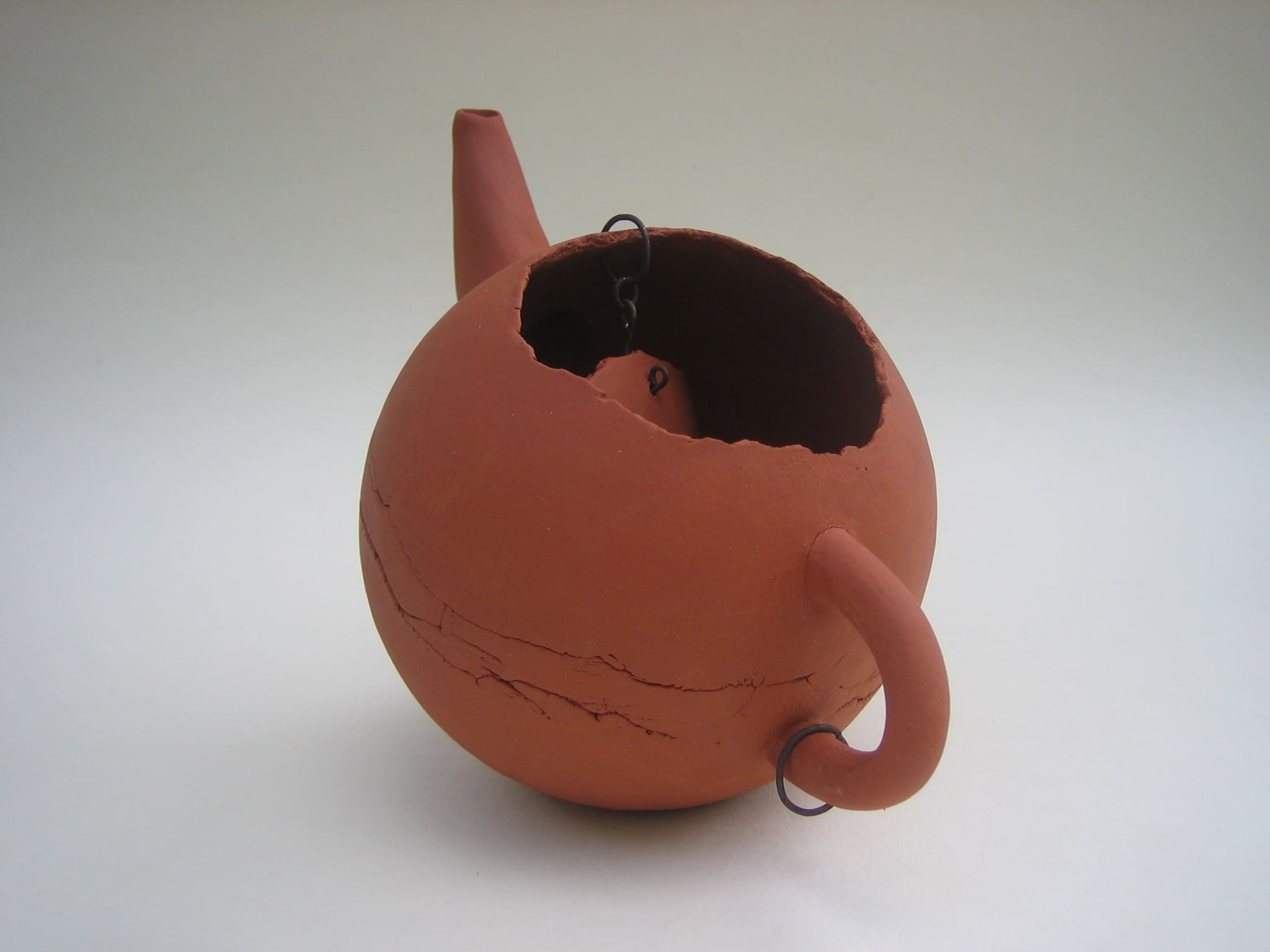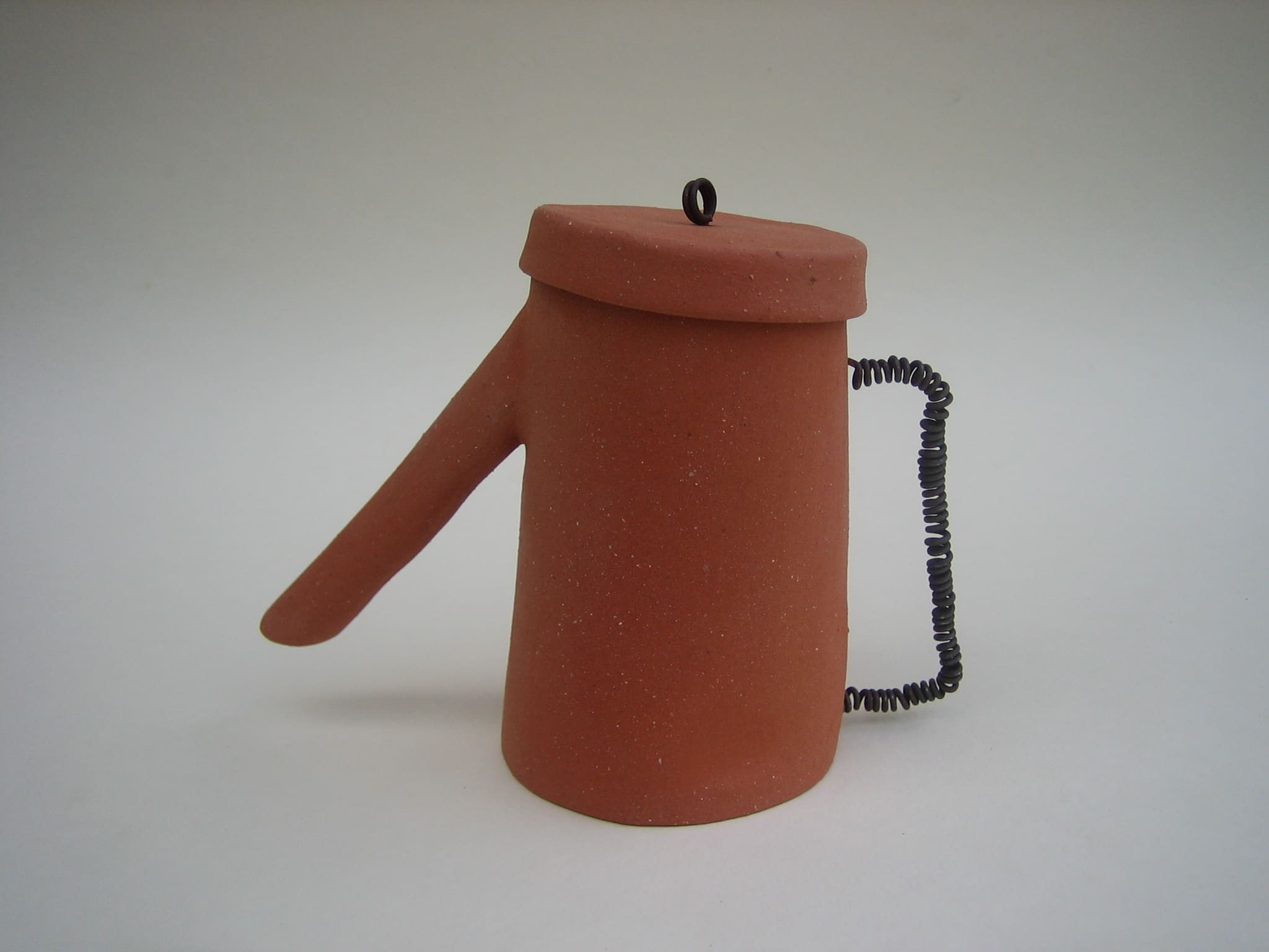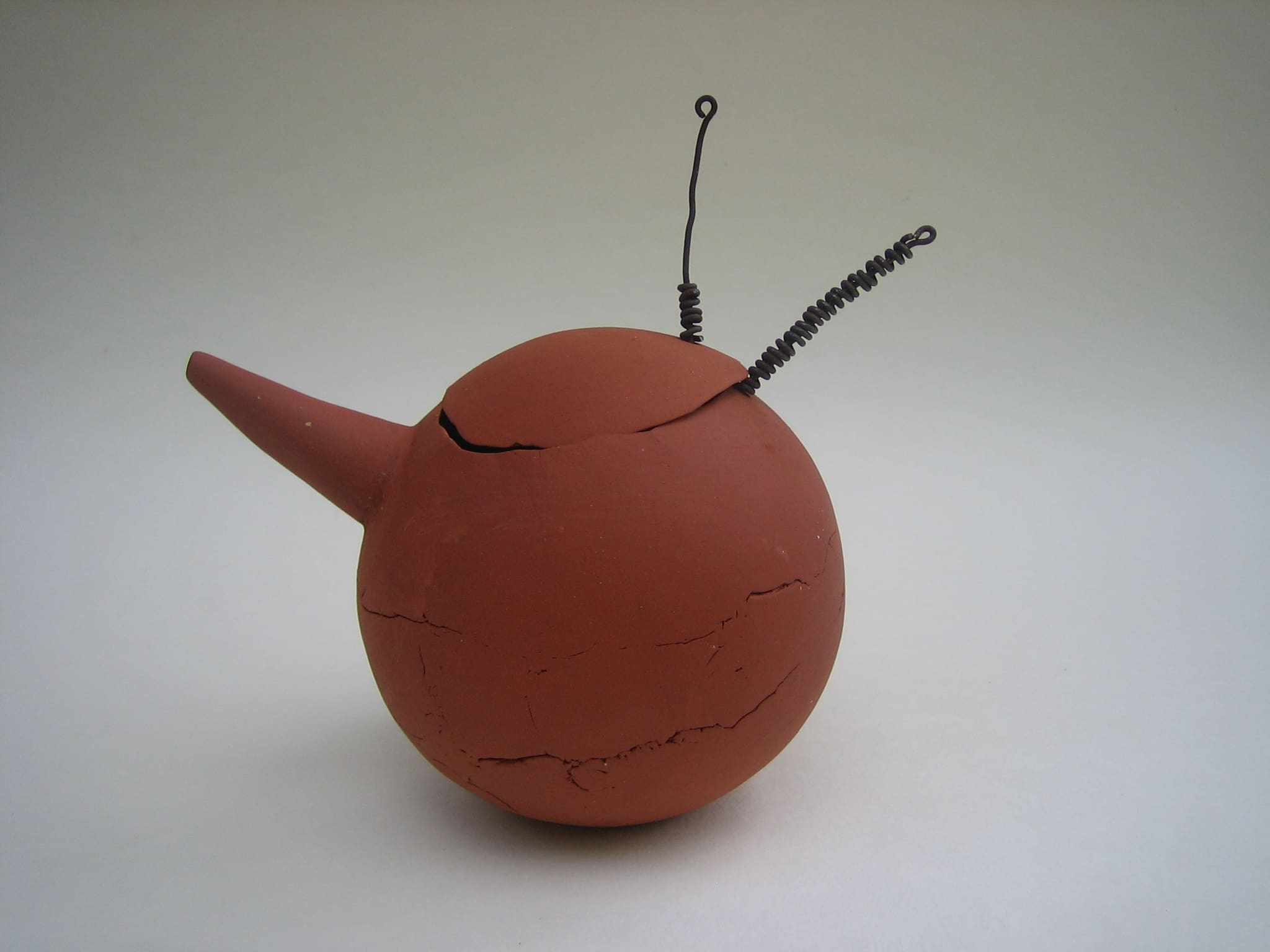 After that I wanted to do something completely opposite, so I made this series of clumsy teapots that are not teapots. None of them works like a teapot should, they are made from red chamotte clay, not glazed, and the lids are attached with rusty iron wire.