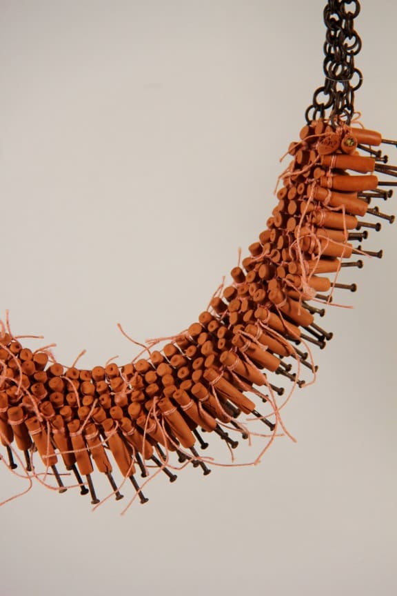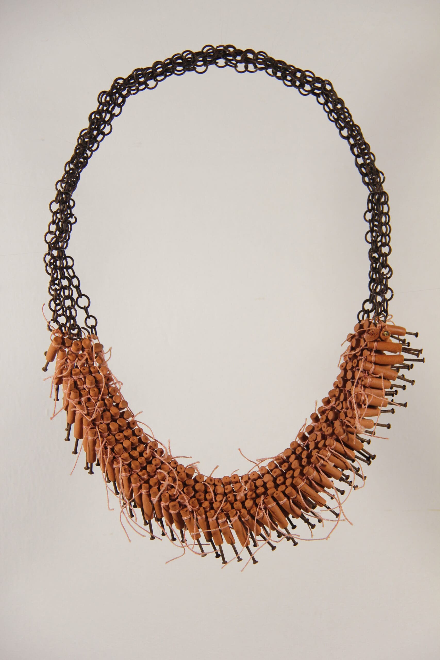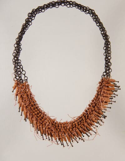 I used nails to express the pain. While wearing this necklace the nails are pointing towards me, but already covered with a ceramic tube which protects me from the sharpness. And they have a golden head. The process of dealing with the pain is already started…