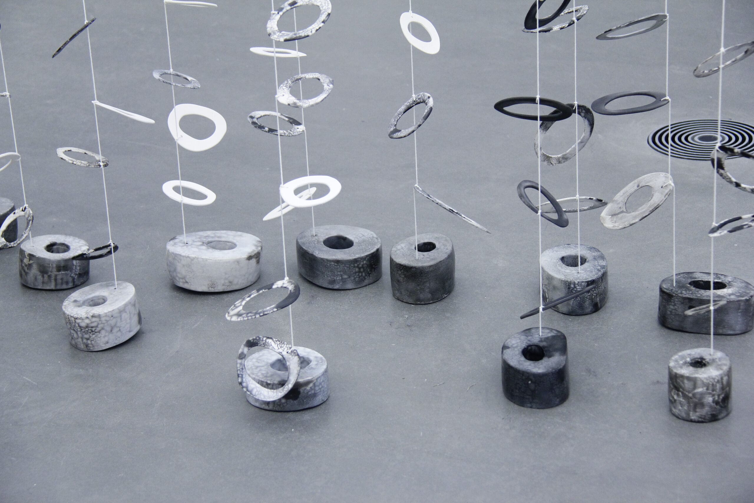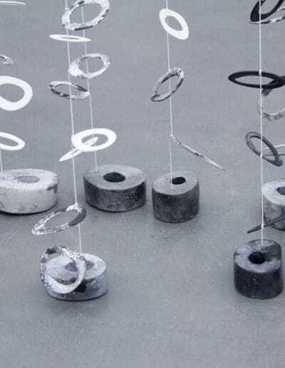 Besides some wearable art pieces exposed in iron frames, I made an installation of ‘petals’ on strings. They turn a little bit when the air in the space is moving.